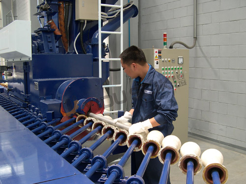 工作原理:是指通過機(jī)械的方法把丸料(鋼丸或鋼砂)以很高的速度和一定的角度拋射到工作表面上,讓丸料沖擊工作表面,然后在機(jī)器內(nèi)部通過配套的吸塵器的氣流清洗,將丸料和清理下來的雜質(zhì)分別回收,并且使丸料可以循環(huán)使用的技術(shù),通過專門針對(duì)管材輸送研發(fā)的輥道機(jī)構(gòu)自動(dòng)輸送管材,使管材邊勻速旋轉(zhuǎn)邊勻速通過拋丸清理區(qū),從而達(dá)到均勻的加工清理目的。